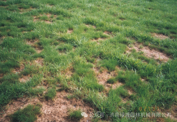 三、夏季斑枯病:夏初開始表現癥狀,發病草坪最初出現凹陷、圓形的小斑塊,以后草株褪綠變成枯黃色;或出現枯草斑塊,直徑約3~8cm,以后斑塊逐漸擴大。典型的斑塊圓形,直徑一般不超過40cm。在持續高溫天氣下(白天高溫達28~35℃,夜溫超過20℃),草坪上多個病斑愈合成片,形成大面積的不規則形枯草斑。禿斑內枯草不能恢復。5-9月是高發期。