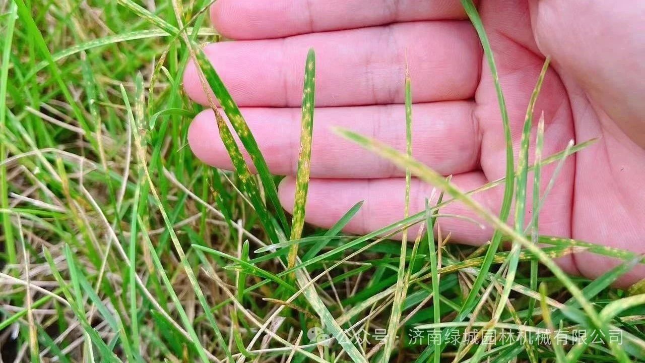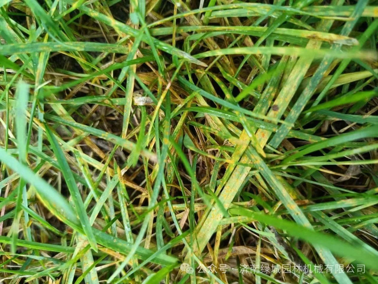 四、銹病:夏秋季危害較重,濟南早熟禾受害較重。初期葉片出現黃色斑點,有黃色粉狀物,后期逐步擴展,葉片上布滿黃色粉狀物,容易識別。