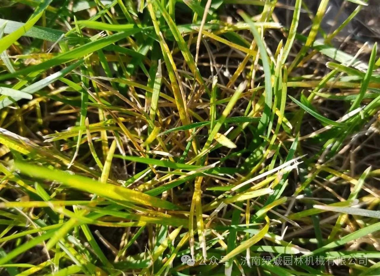 二、發生規律:春季危害較輕,以秋季危害最重。每年7月陸續發生,以9-10月危害最重。濟南在7月份開始發生,局部危害較重,大部分基本較輕或無發生。往年地塊發病過的,今年會繼續發生。所以之前有銹病危害的草坪,要及時觀察,及時預防。一般危害至11月份,冬孢子越冬后第二年會繼續侵染。銹病后期,遠看草坪呈現一片枯黃色,近處觀察可見葉片上布滿黃色銹狀物。草坪長勢弱、土壤板結、土壤貧瘠、低洼處容易發生。