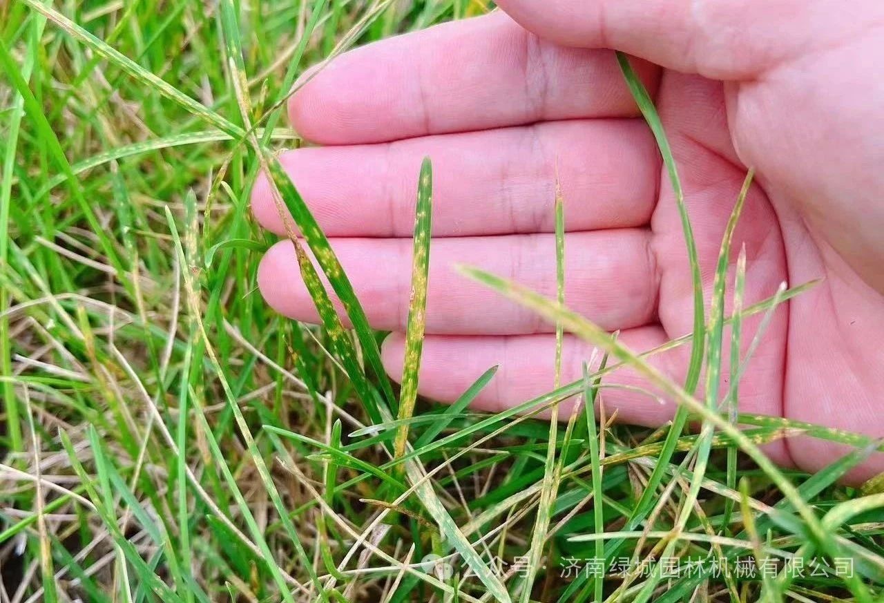 2、及時檢查,及時用藥:7月份開始,每周檢查1-2次,看看葉片上是否有黃色銹狀物,如有,所有草坪統一打一次殺菌劑白秀鯊+貝健。打藥要均勻細致,地面也要噴到藥液,間隔7天,連續2次。